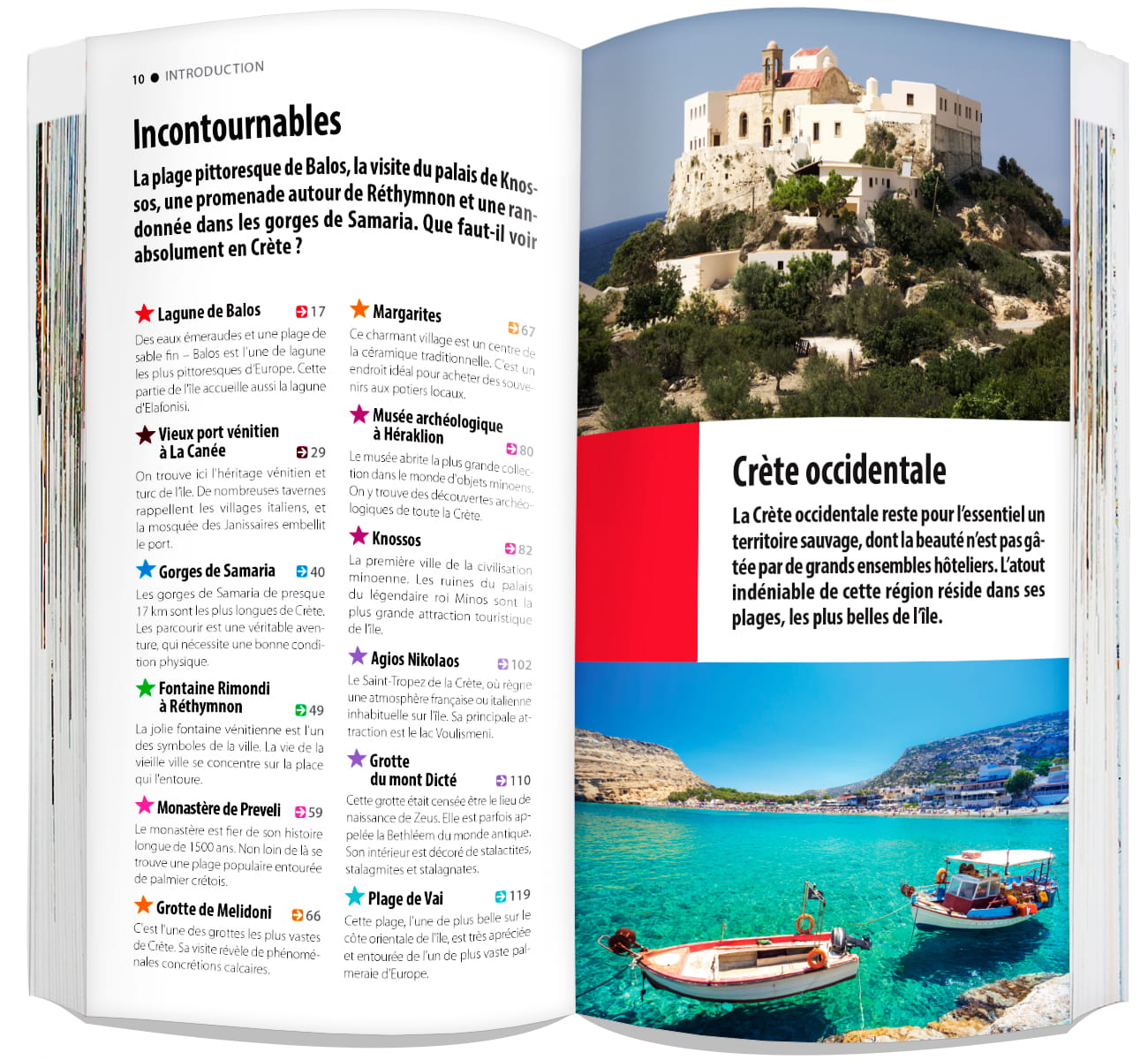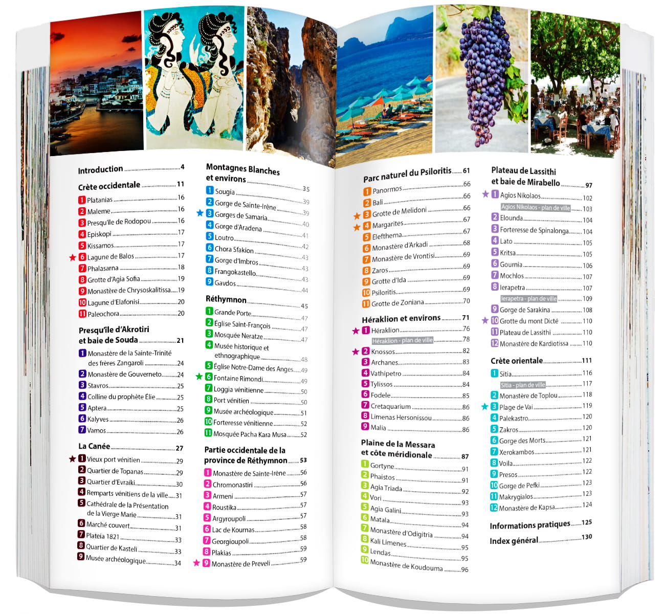 Architecture vénitienne de La Canée et Réthymnon, les environs touristiques d’Héraklion, les bâtiments colorés d'Agios Nikolaos. Les plus belles plages aux sables fins et les eaux d'émeraude. Le trekking dans les gorges et les montagnes. Les vestiges antiques répartis sur l'île. Le meilleur de la cuisine méditerranéenne – huile d'olive, feta, fruits de mer et vin local. Toutes les attractions qui créent l'atmosphère unique de l'île sont décrites dans ce guide.